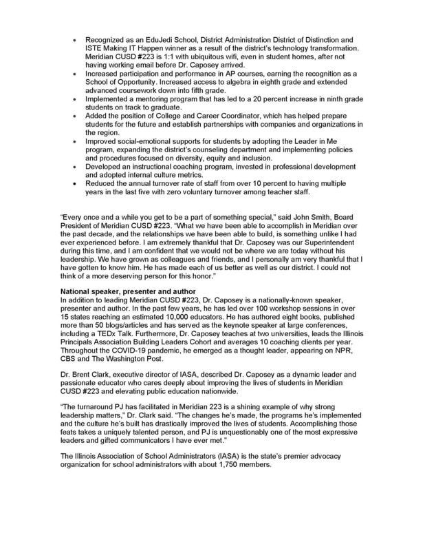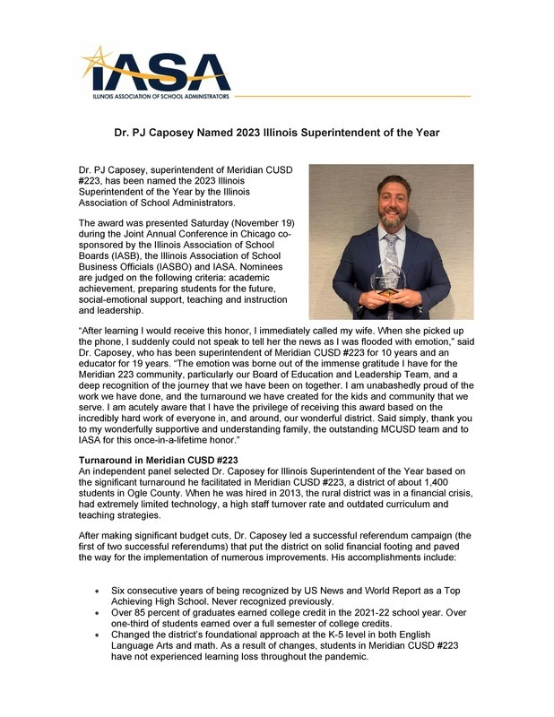 Dr. PJ Caposey, superintendent of Meridian CUSD #223, has been named the 2023 Illinois Superintendent of the Year by the Illinois Association of School Administrators.